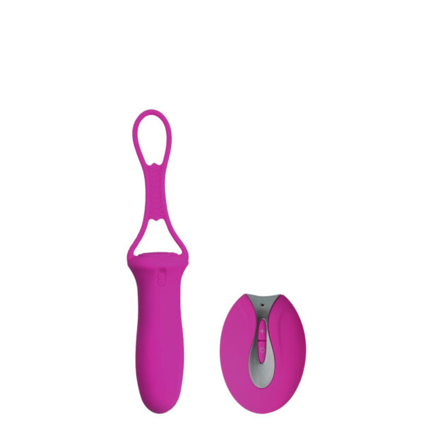 Bullet recarregável com alça e controle remoto. Possui 10 modos de vibração.