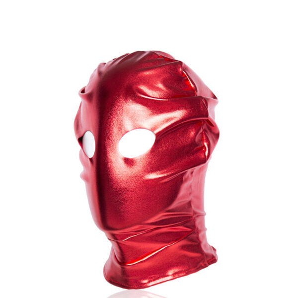 Capuz com abertura na região dos olhos e fechamento com zíper traseiro.