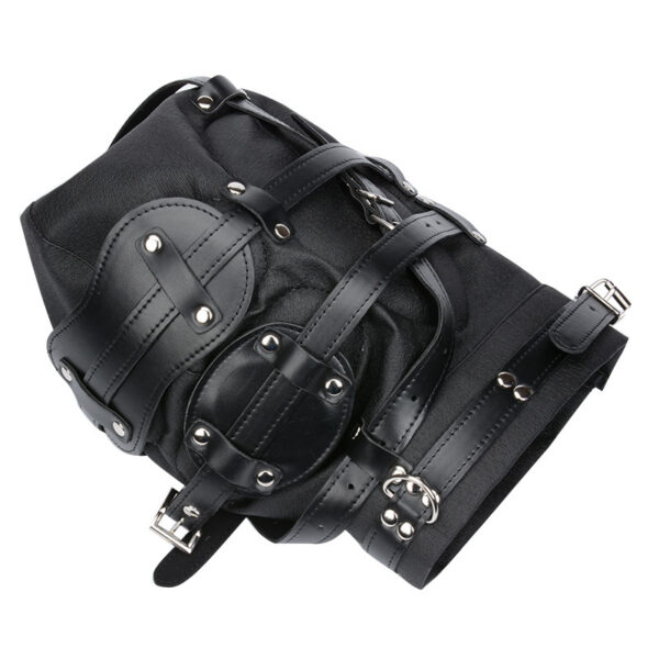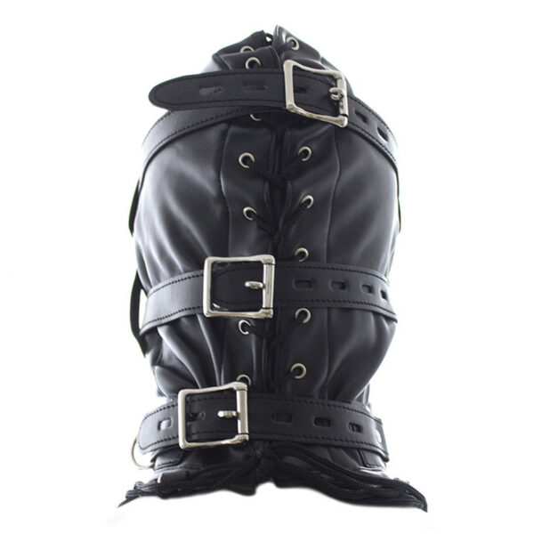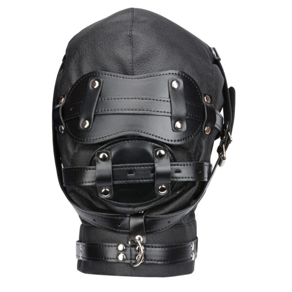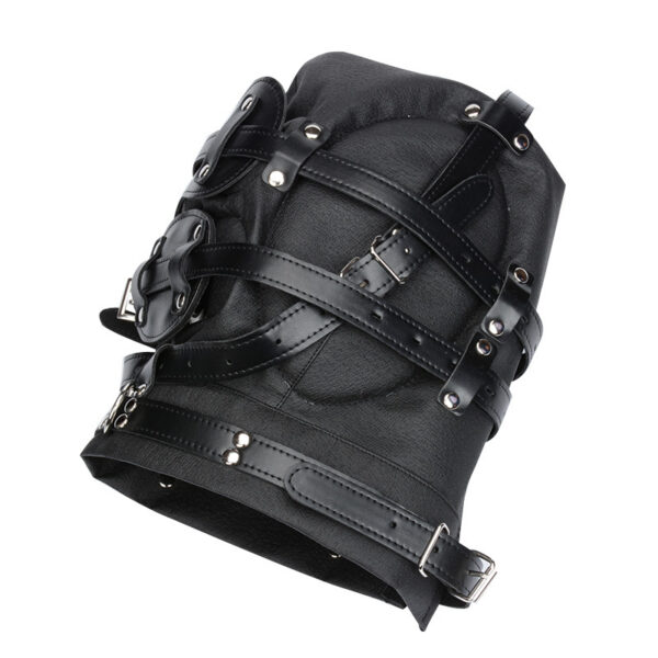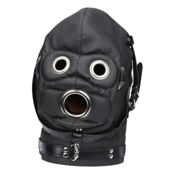 Capuz com mordaça em formato de pênis e venda para os olhos. Possui fivelas que permite prender com cadeados e acabamentos em metal nos olhos e boca.