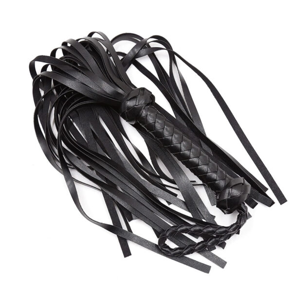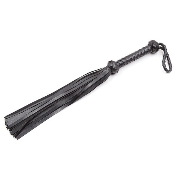 Chicote com franja, empunhadura com tiras trançadas e alça para punho.