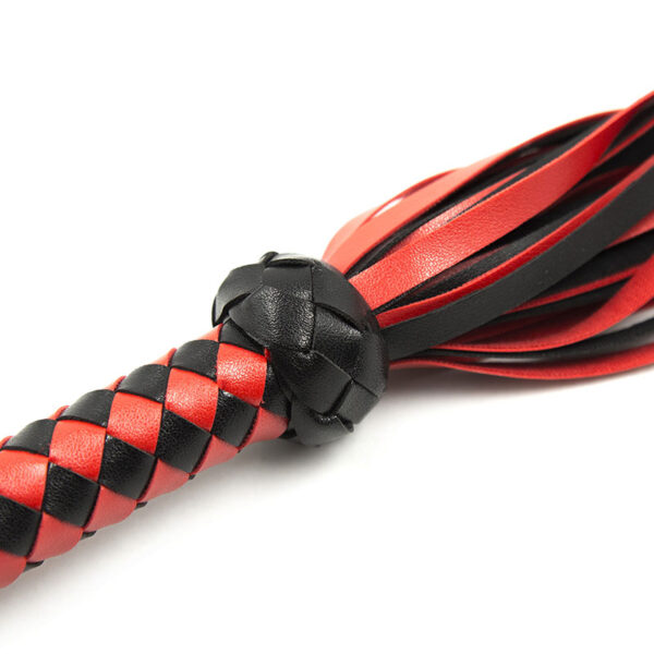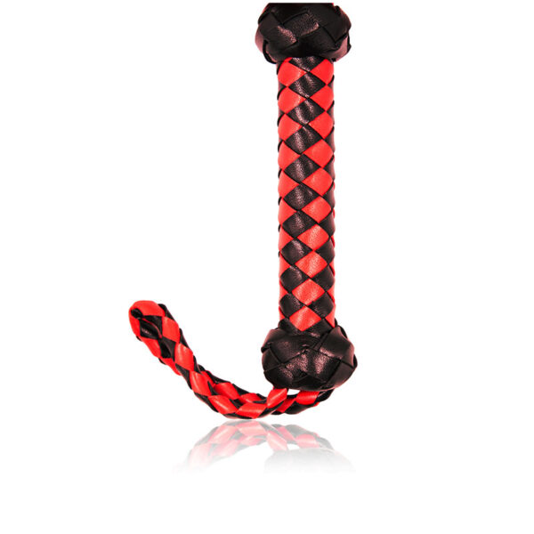 Chicote com franja, empunhadura com tiras trançadas e alça para punho.