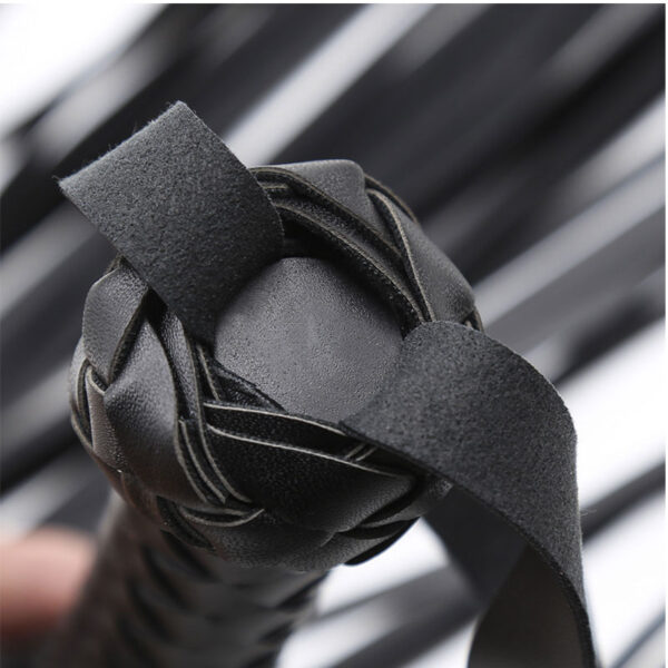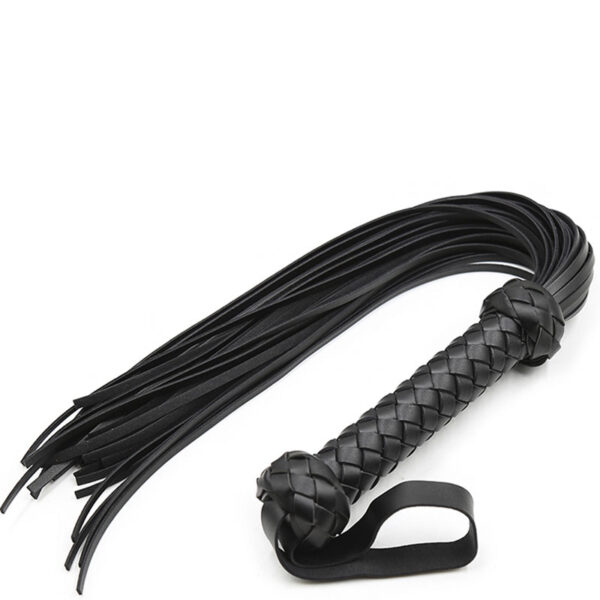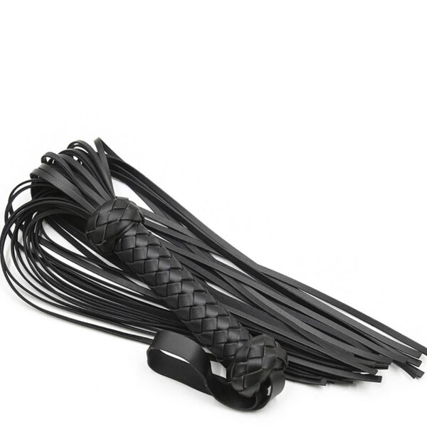 Chicote com franja, empunhadura com tiras trançadas e alça para punho.