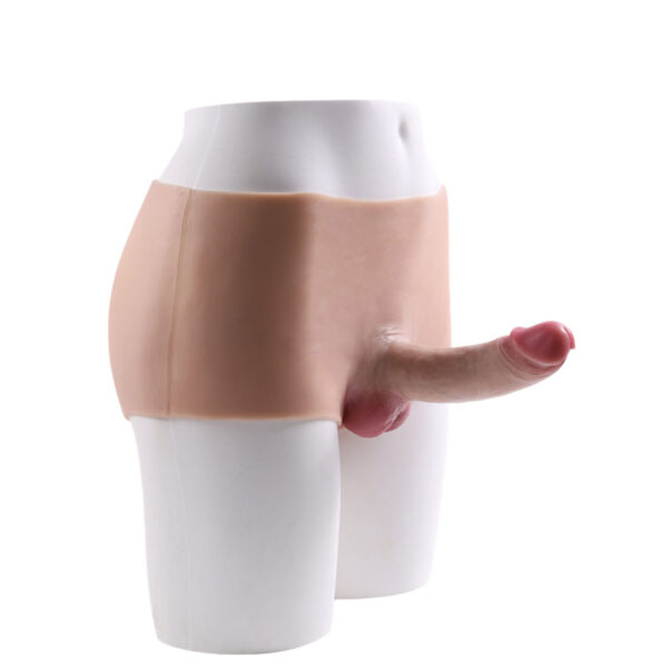 Cinta peniana estilo short com pênis realístico com escroto, veias salientes e glande.