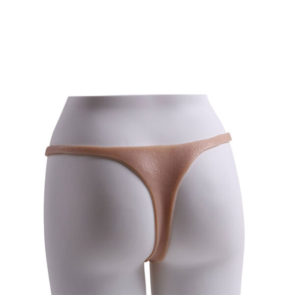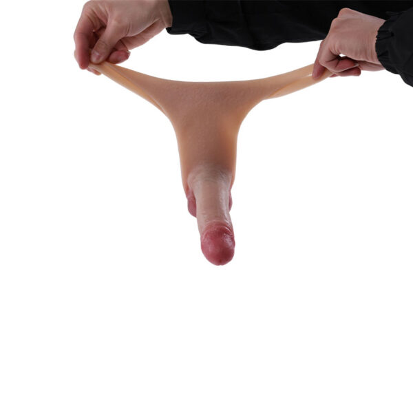 Cinta peniana estilo tanga com pênis realístico com escroto, veias salientes e glande.