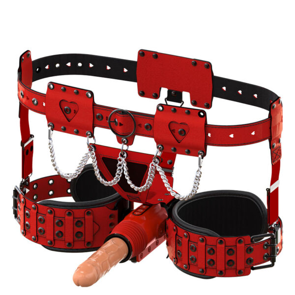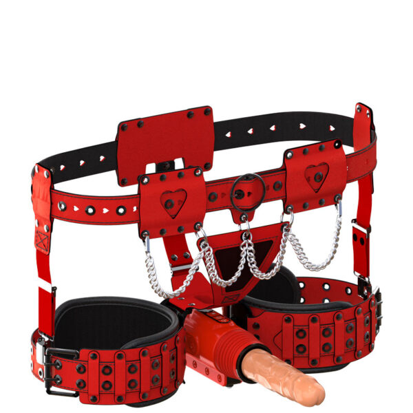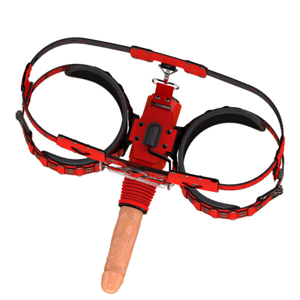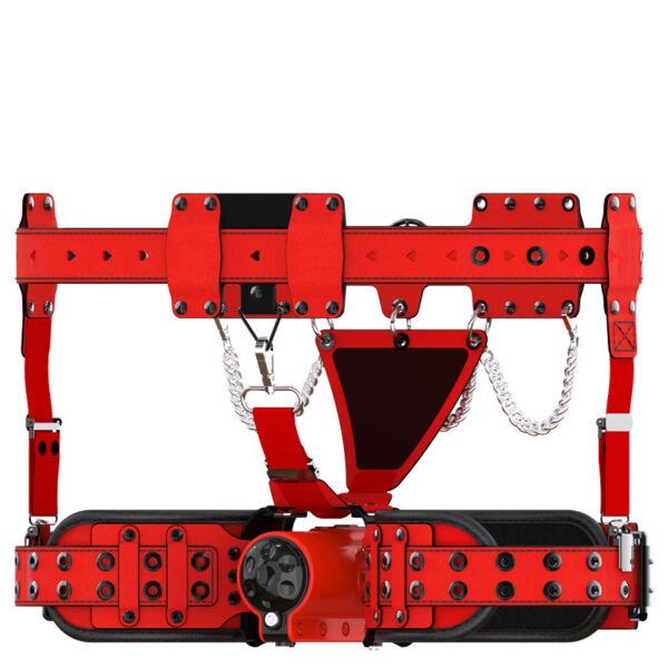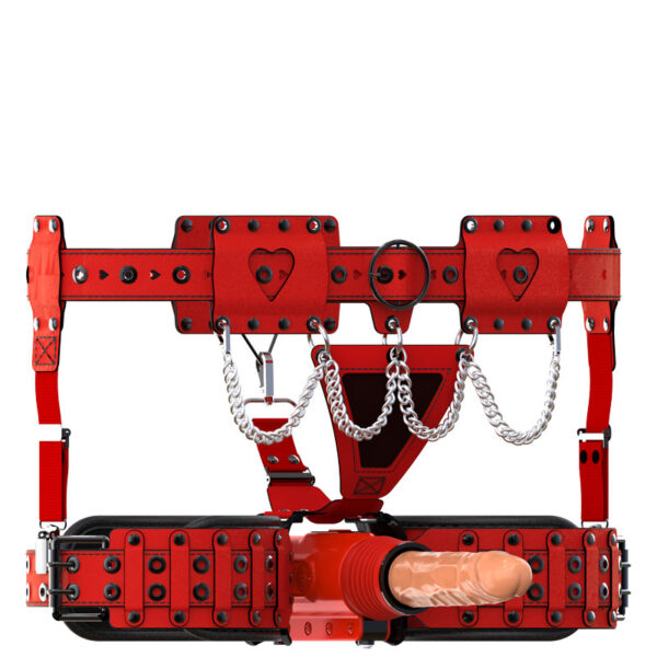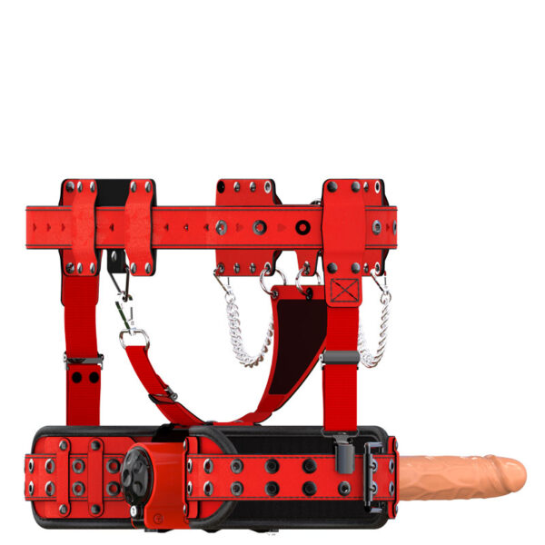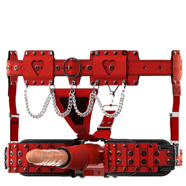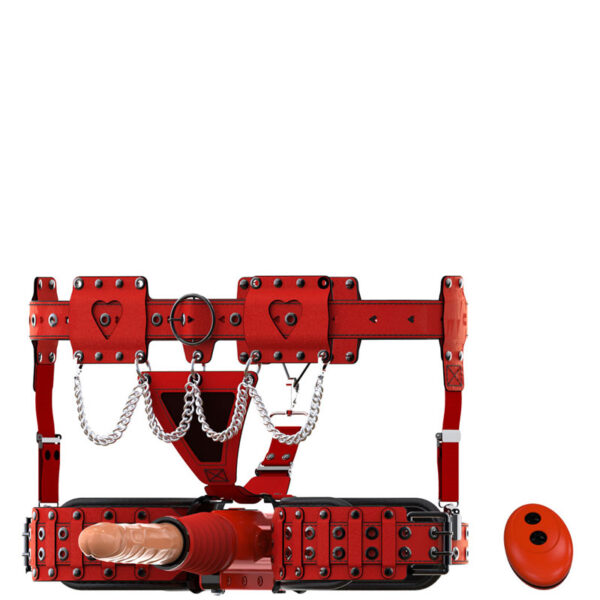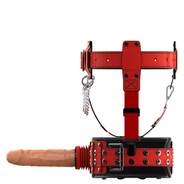 Cinta peniana recarregável com prótese articulável, movimentos de vai e vem, cinta reforçada e detalhes em corrente, possui controle remoto. Cinta ajustável.