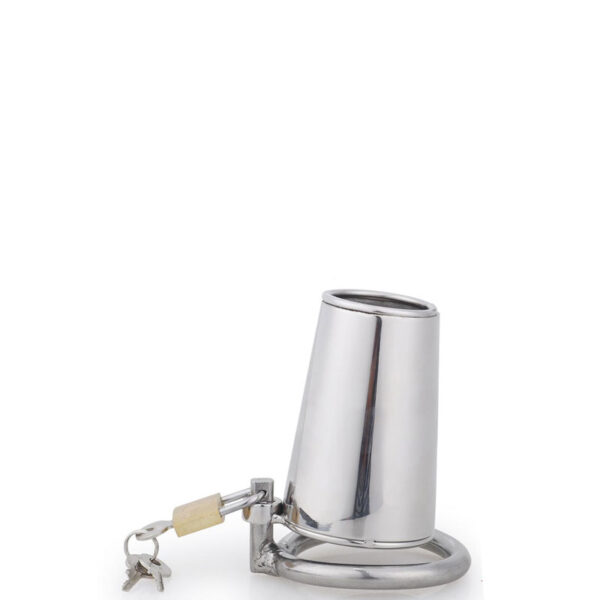 Cinto de castidade masculino fechado com abertura na ponta, possui anel para o escroto e cadeado.
