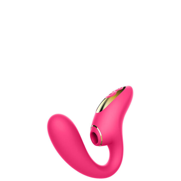 Estimulador clitoriano recarregável com ondas de pressão e penetrador ponto G. Possui 10 modos de vibração e 5 modos de ondas de pressão.