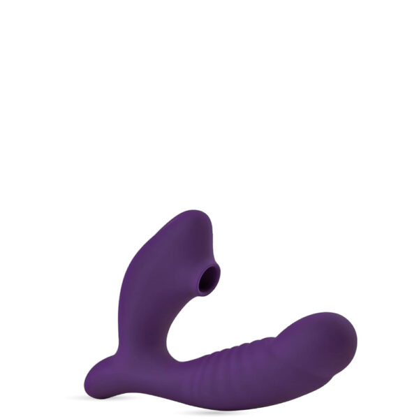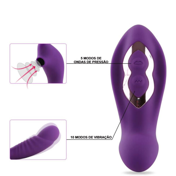 Estimulador clitoriano texturizado recarregável com ondas de pressão e penetrador ponto G. Possui 10 modos de vibração e 5 modos de ondas de pressão.