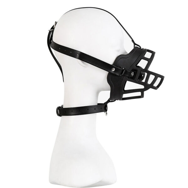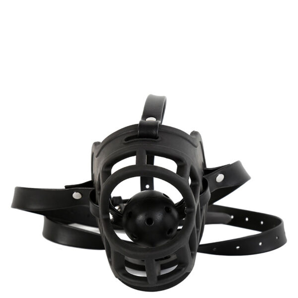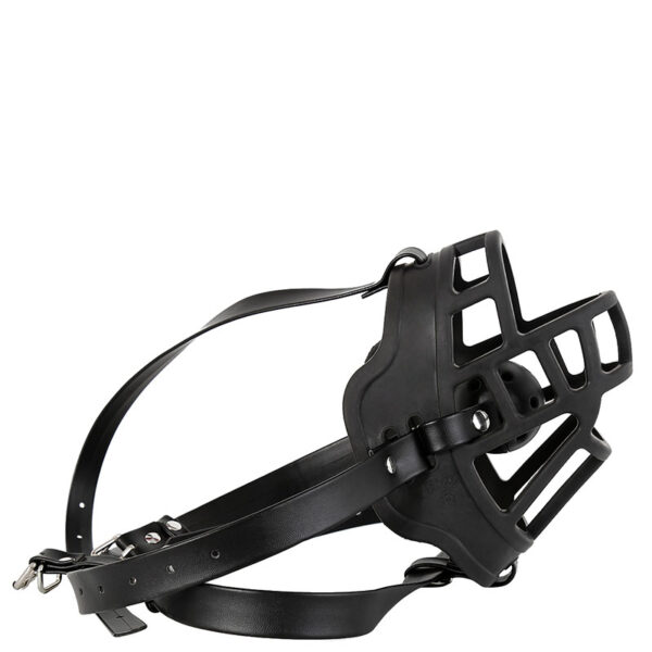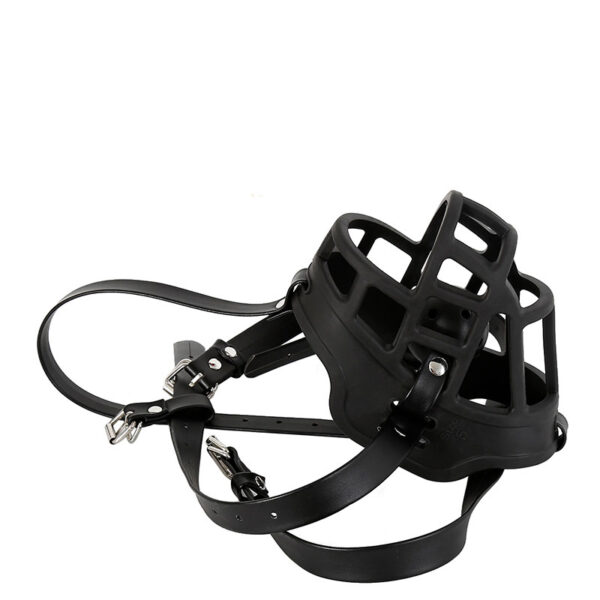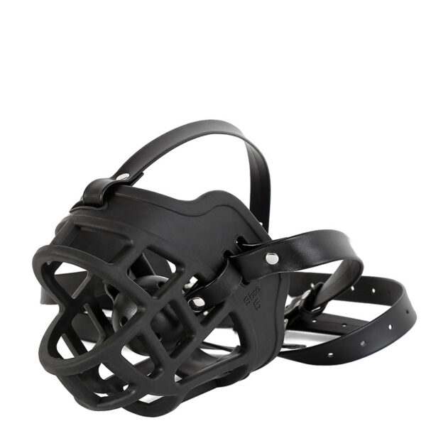 Focinheira gradeada com mordaça de bola, alça dupla e regulagem por fivelas.