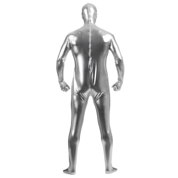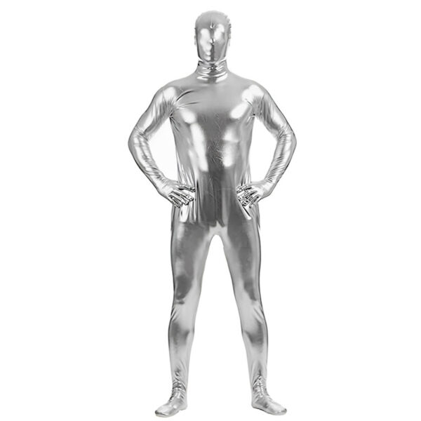 Macacão zentai prata brilhante totalmente fechado e com zíper nas costas.