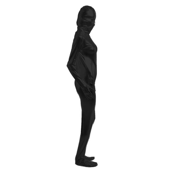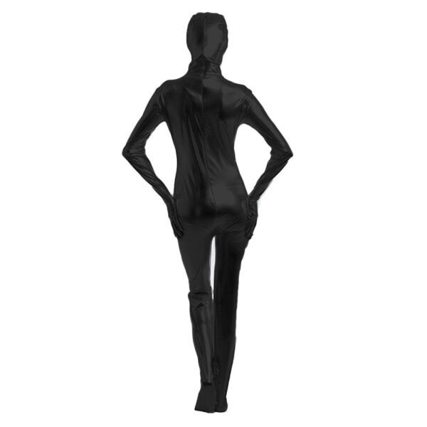 Macacão zentai preto brilhante totalmente fechado e com zíper nas costas.