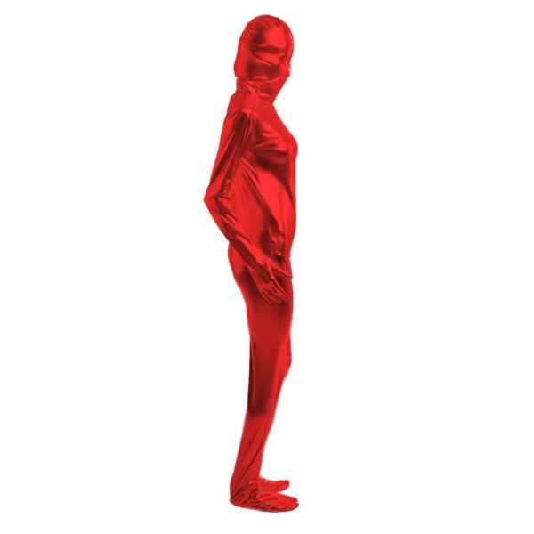 Macacão zentai vermelho brilhante totalmente fechado e com zíper nas costas.