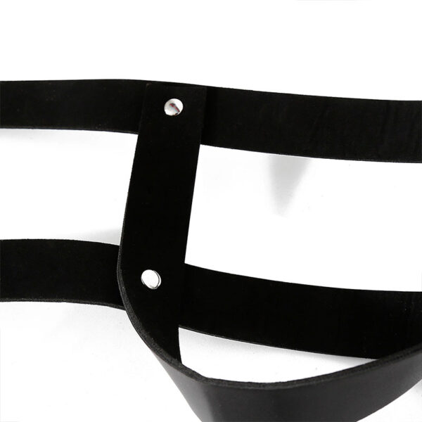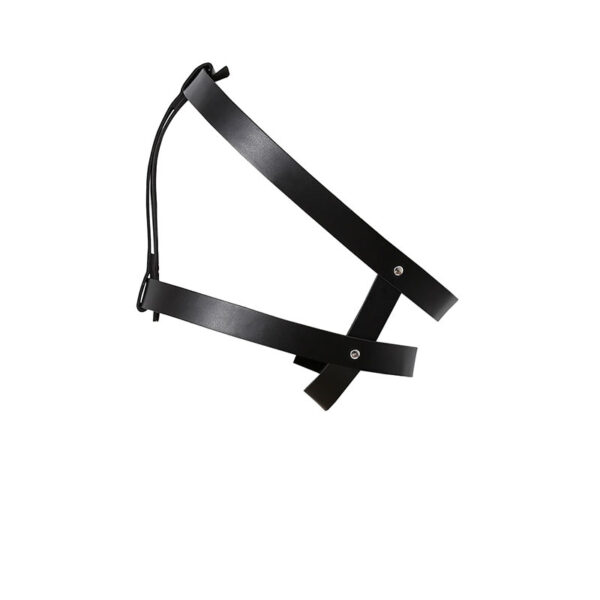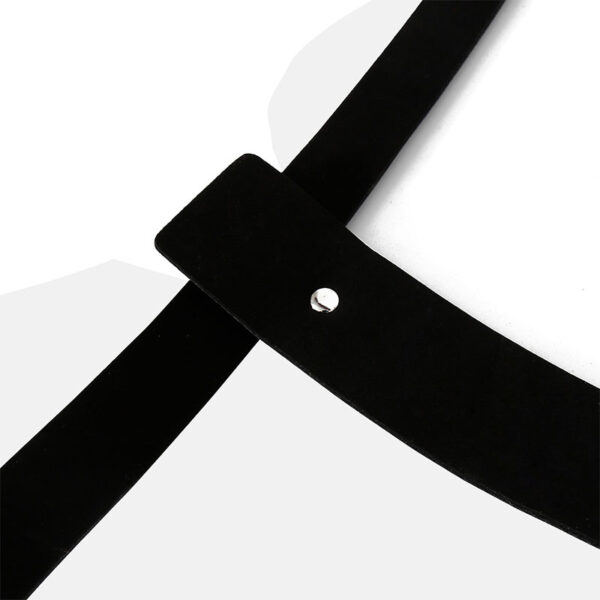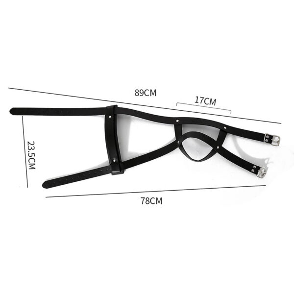 Máscara para fetiche em podolatria, permite prender o sapato cobrindo a boca e nariz através de duas tiras ajustáveis com fivelas.