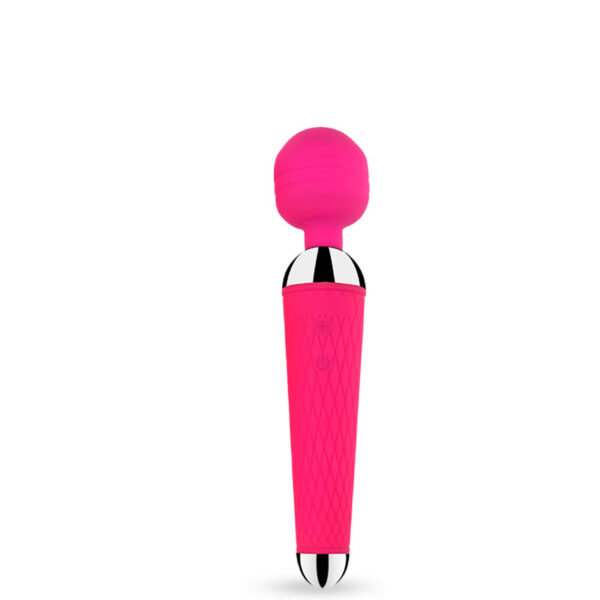 Massageador recarregável corporal em silicone, com formato ergonômico, corpo texturizado com detalhes metálicos e cabeça flexível. Possui 10 modos de vibração.