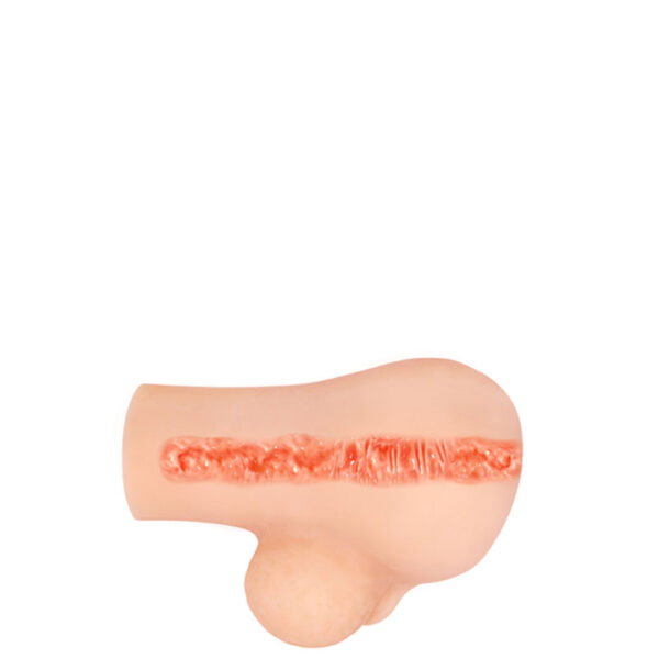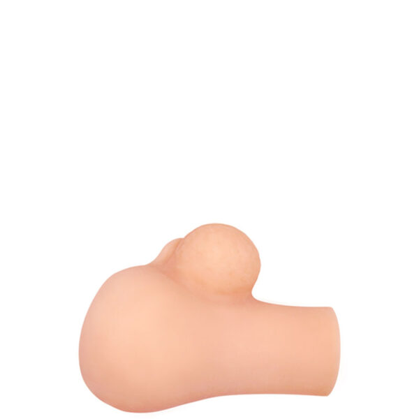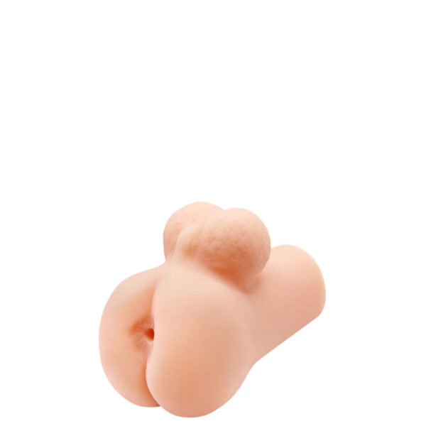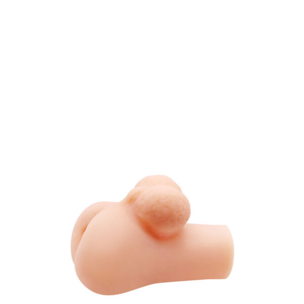 Masturbador formato bumbum masculino. Possui ânus penetrável, textura interna texturizada e escroto.