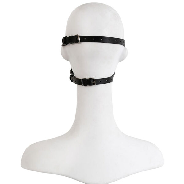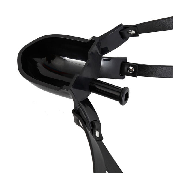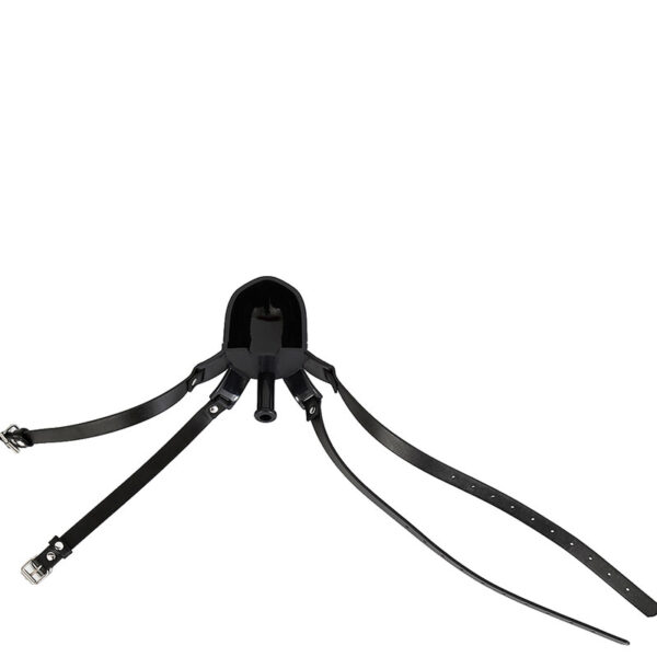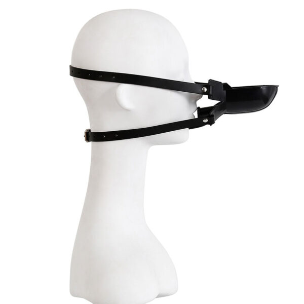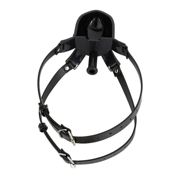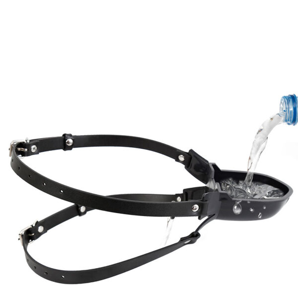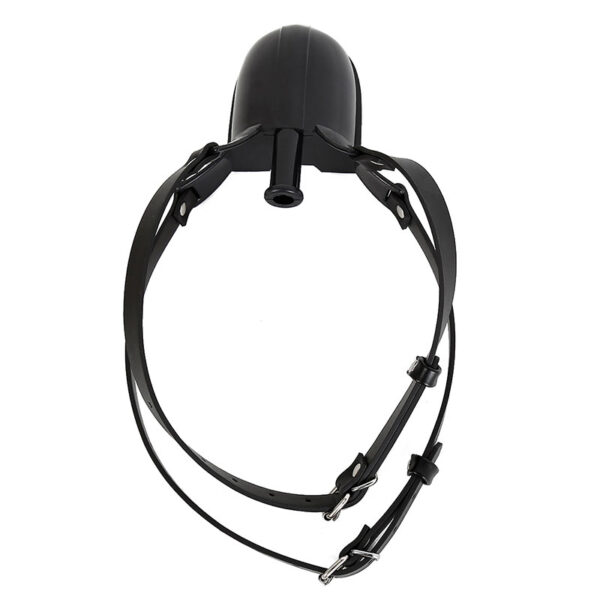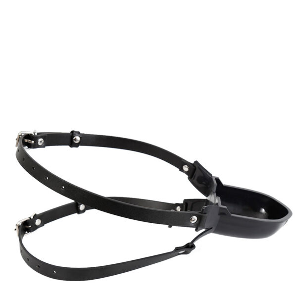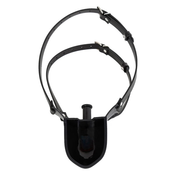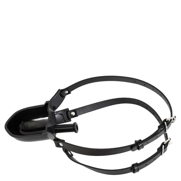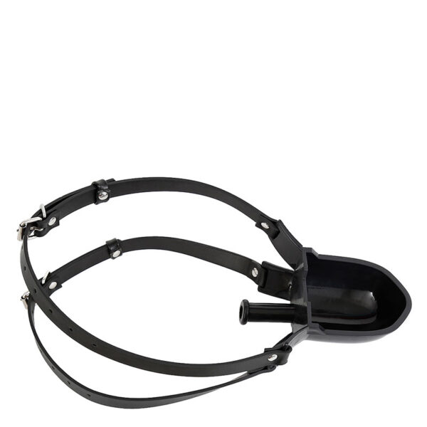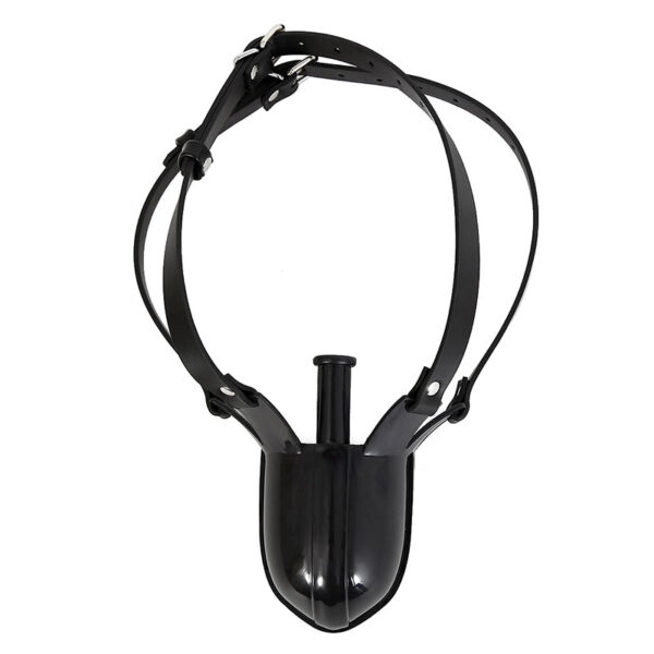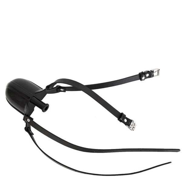 Mordaça com bocal acoplado a um funil tipo concha para introdução de líquidos. Possui dupla tira com fivelas, proporcionando uma melhor fixação e segurança da mordaça.