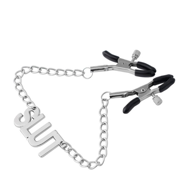 Par de grampos para mamilos com regulagem, possui corrente que interliga os dois grampos com pingente escrito SLUT.