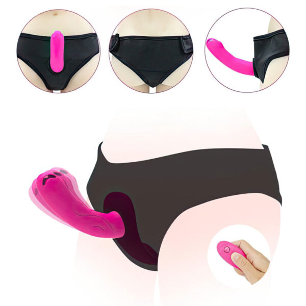Penetrador strapless recarregável com controle. Possui 10 modos de vibração e acompanha cinta peniana modelo tanga.