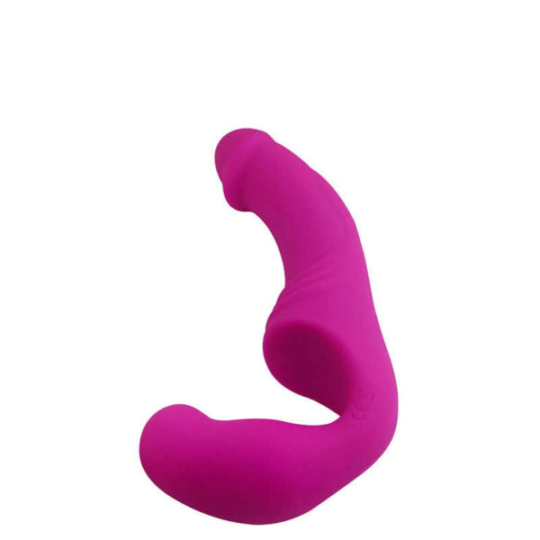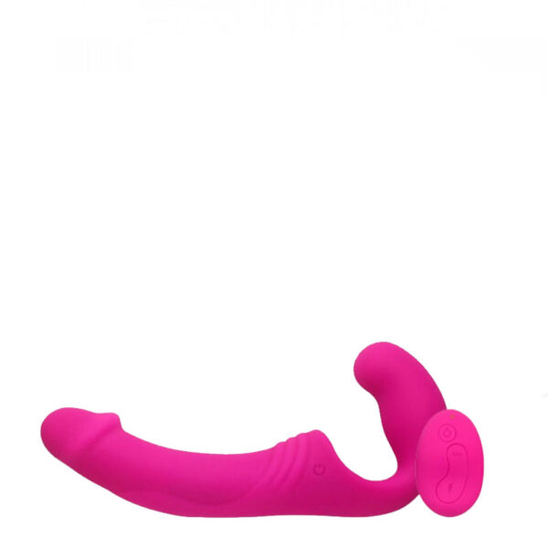 Penetrador strapless recarregável com plug vaginal wireless, permite que o uso seja feito sem cintas, com total liberdade e intimidade com o(a) parceiro(a), possui 10 modos de vibração e função de intensidade de vibração.