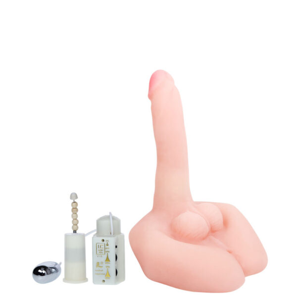 Masturbador em cyberskin com pênis, possui cápsula rotativa multivelocidade, controle que simula efeitos sonoros de gemidos femininos, Pênis articulável com veias, glande e escroto.