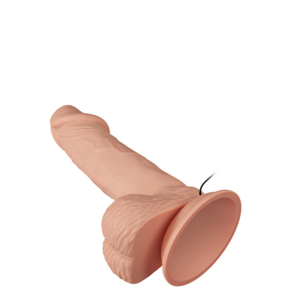 Pênis realístico 19,4 cm com vibração multivelocidade. Possui dupla densidade, interior firme e pele exterior suave e maleável, veias salientes, escroto e ventosa.