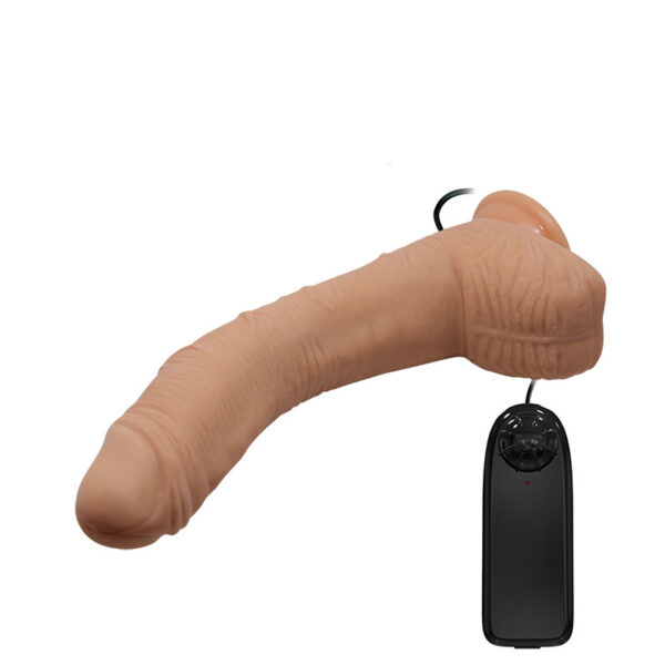 Pênis realístico 28 cm com vibração multivelocidade, possui corpo texturizado, glande, escroto e ventosa.