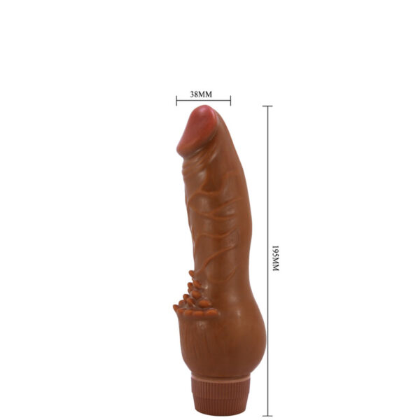 Pênis realístico com saliências estimuladoras, veias e glande. Possui vibração multivelocidade.
