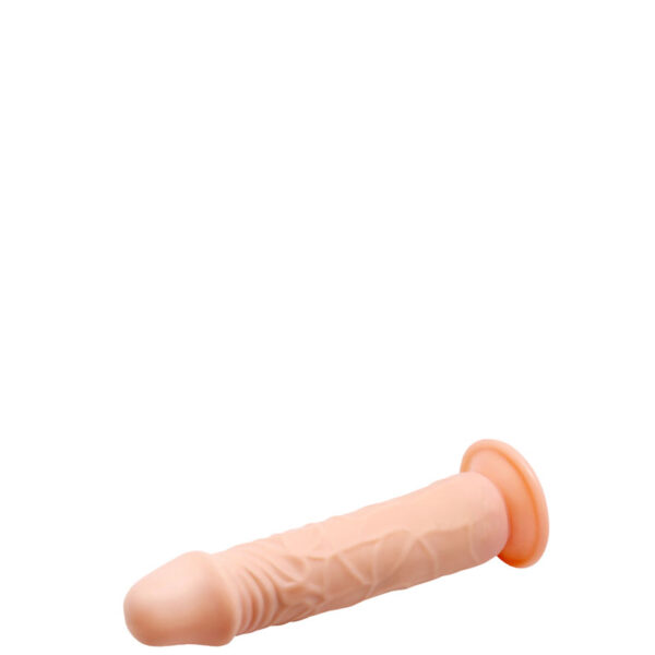 Pênis realístico com ventosa, possui veias e glande saliente.