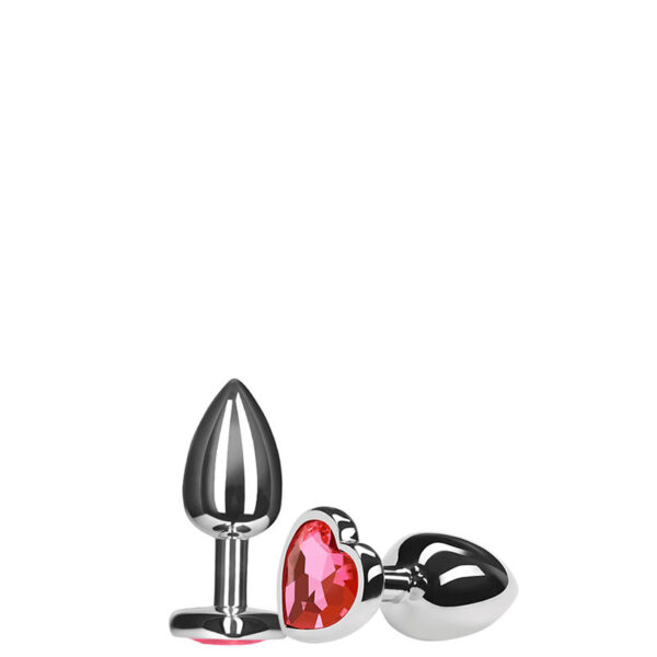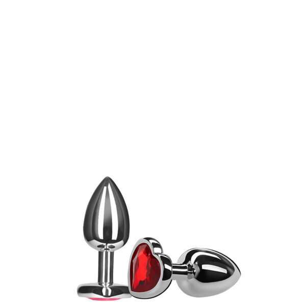 Plug anal em alumínio, pequeno, com aplicação de uma pedra colorida em sua base, formato coração.