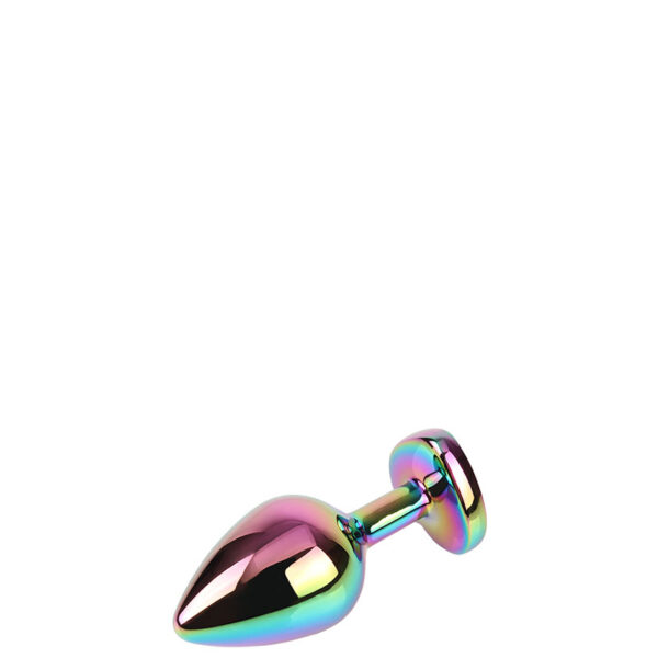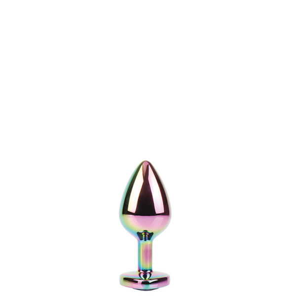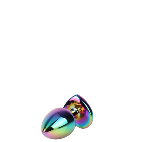 Plug anal médio em metal furta-cor. Possui em sua base formato coração uma pedra colorida lapidada como uma jóia.