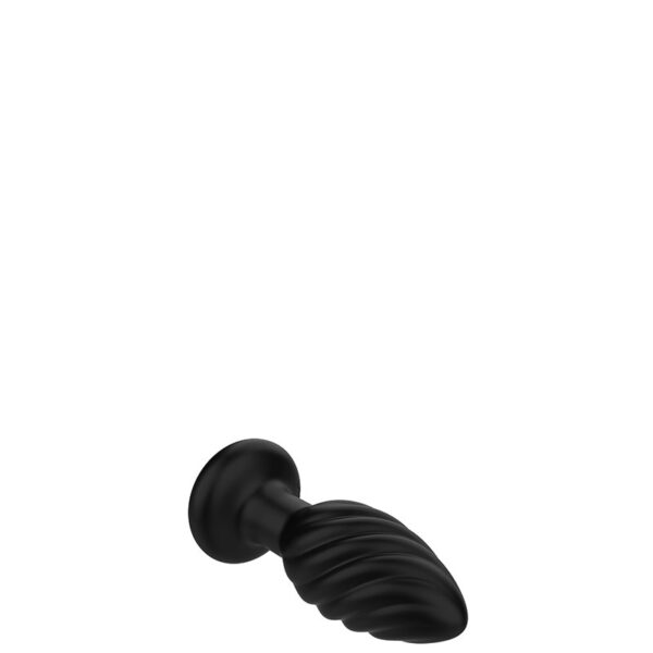 Plug anal recarregável com textura espiral e controle remoto. Possui 10 modos de vibração.