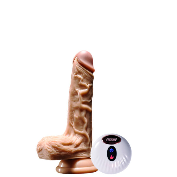 Prótese realística 18,5 cm recarregável com veias salientes, glande, escroto e ventosa. Possui 10 modos de vibração, 3 modos de rotação e controle remoto.