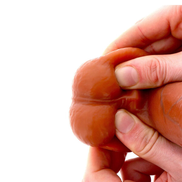 Prótese realística 21,5 cm, com camada de dupla densidade, macio por fora e interior firme. Possui diâmetro avantajado, escroto, veias salientes e ventosa.