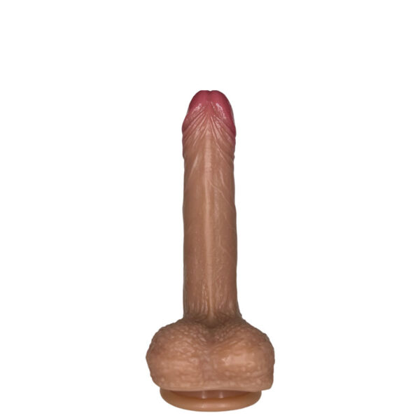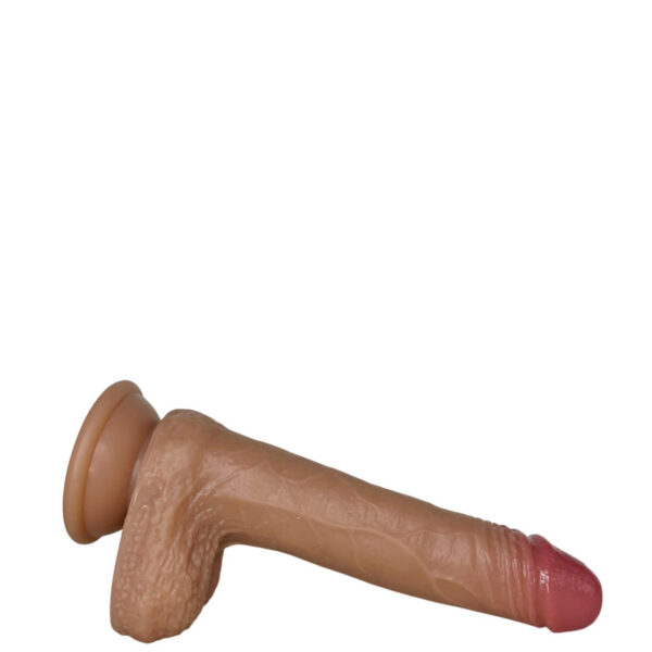 Prótese realística com camada de dupla densidade, macio por fora e interior firme. Possui glande pequena, veias salientes e escroto e ventosa.