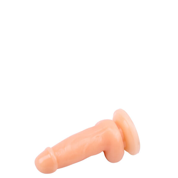 Prótese realística com escroto, corpo liso, glande e ventosa.