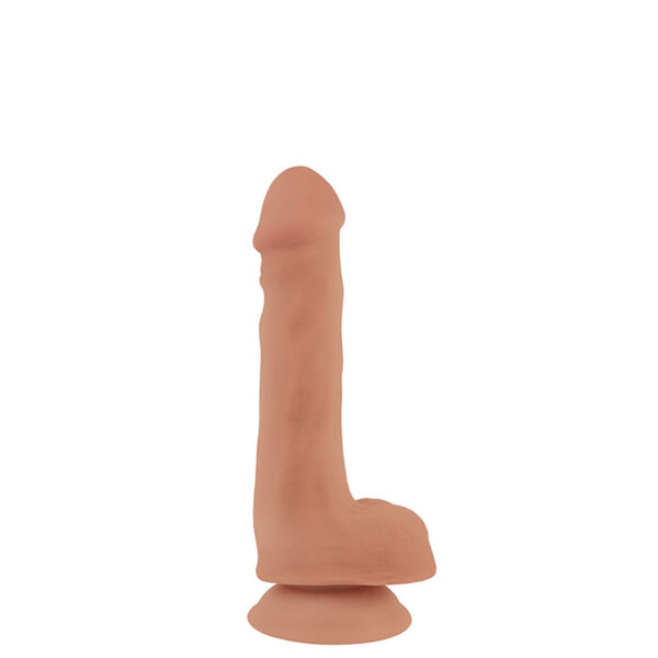 Prótese realística com escroto, veias, glande pequena e ventosa.