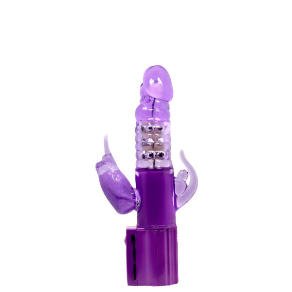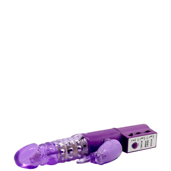 Vibrador com relevo escalonado e estimulador clitoriano formato coelho. Possui vibração multivelocidade.