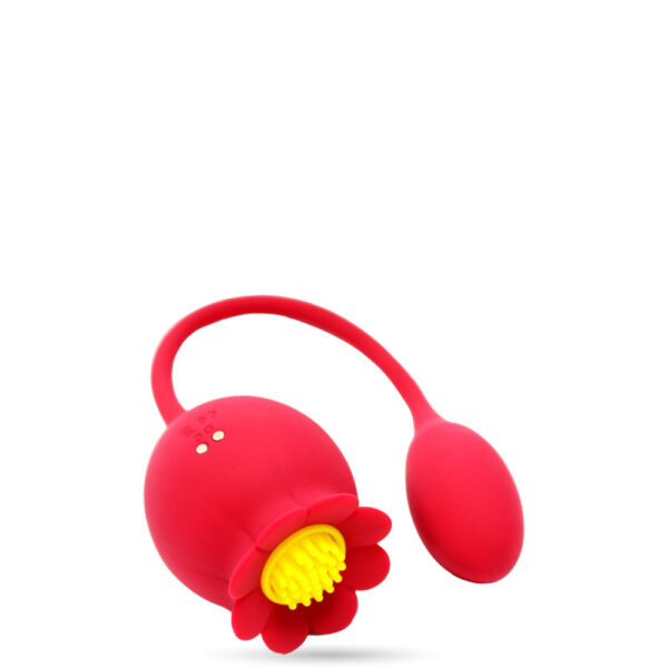 Vibrador duplo recarregável formato de rosa com penetrador, possui controle via aplicativo de qualquer parte do mundo. Possui 6 modos de vibração.