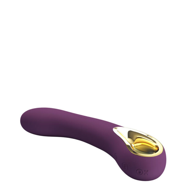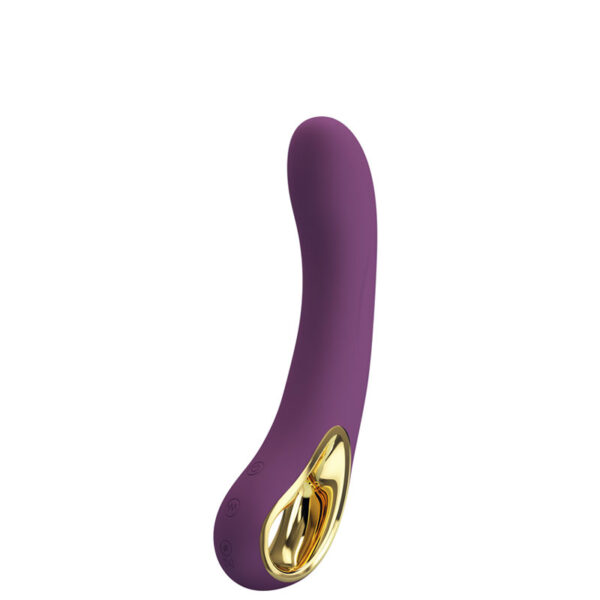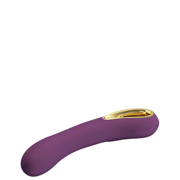 Vibrador recarregável com alça metalizada, levemente curvado na ponta para estimulação do ponto G. Possui 12 modos de vibração controlado via aplicativo de qualquer parte do mundo.
