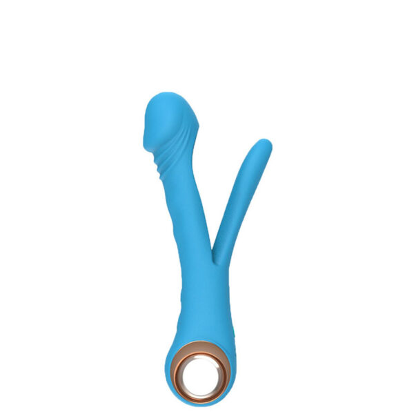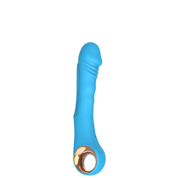 Vibrador recarregável com detalhe de glande e alça metalizada. Possui 10 modos de vibração.