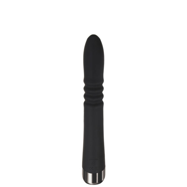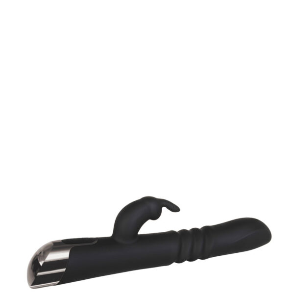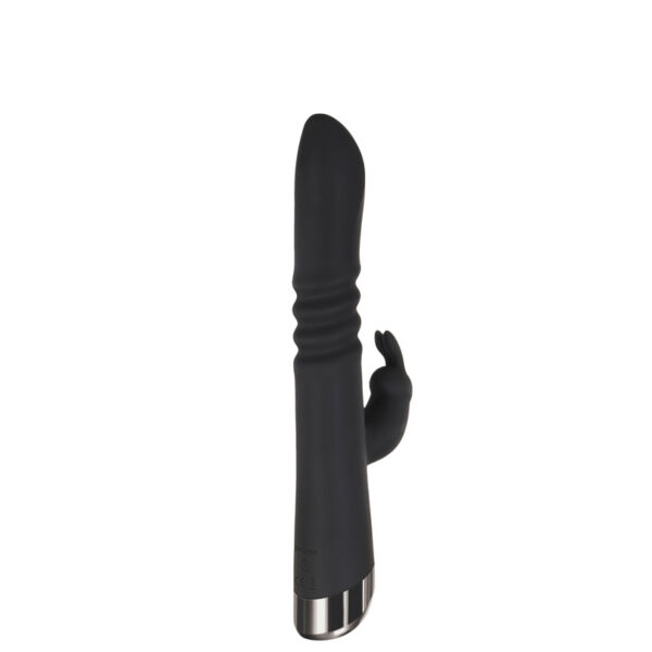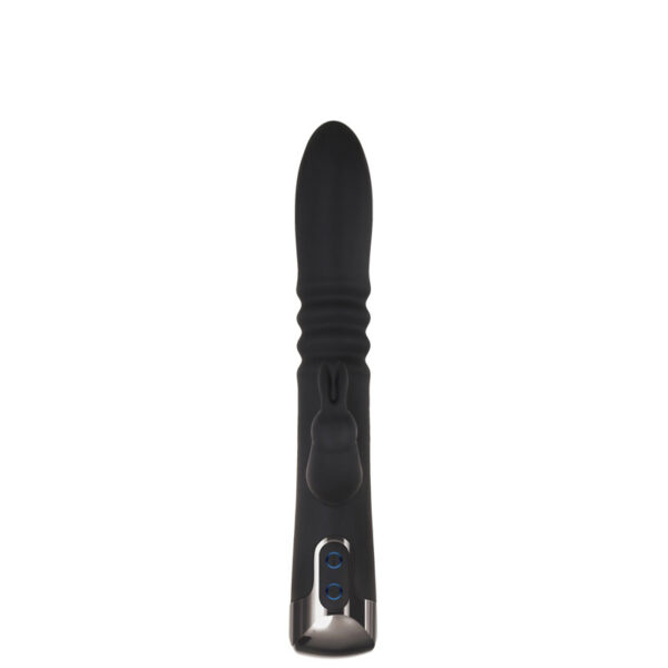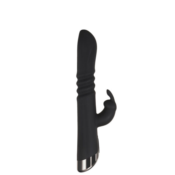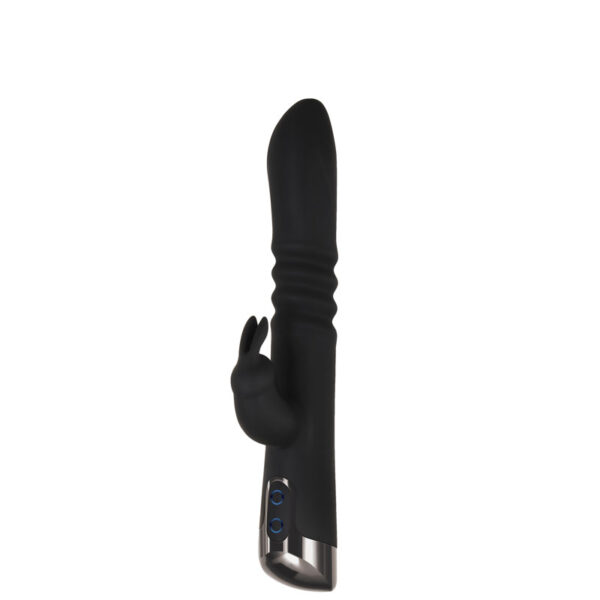 Vibrador recarregável com vai e vem e estimulador clitoriano formato coelho. Possui 7 modos de vibração e 3 modos de movimentos.
