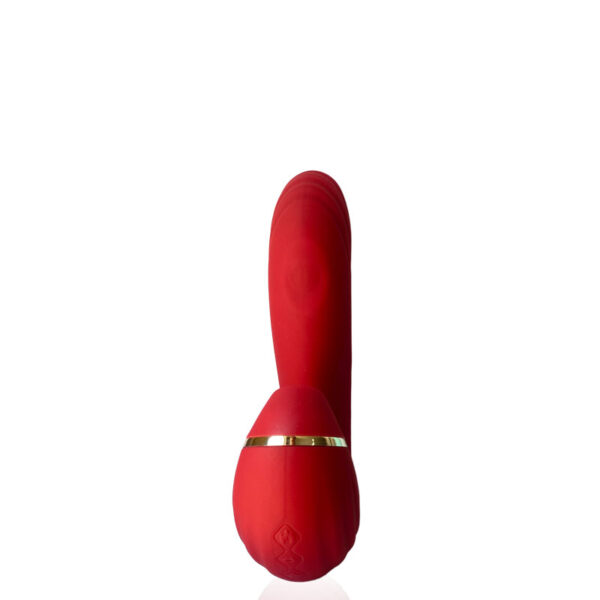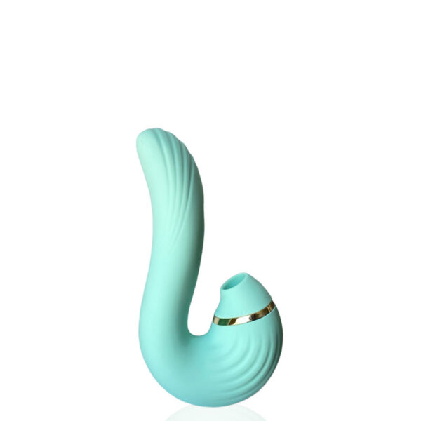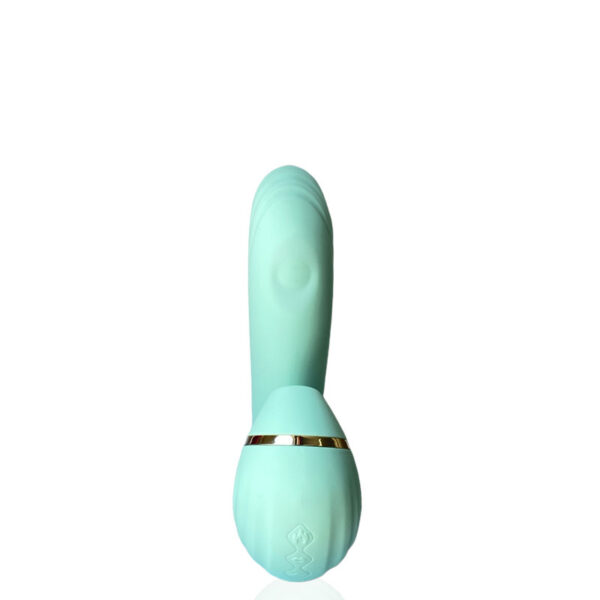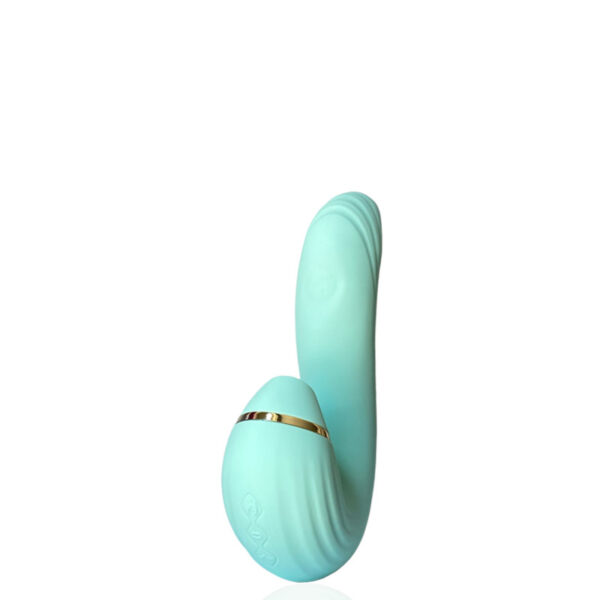 Vibrador recarregável ponto G com estimulador clitoriano. Possui 4 modos de vibração, 4 modos de pulsação, 4 modos de ondas de pressão e função de aquecimento.