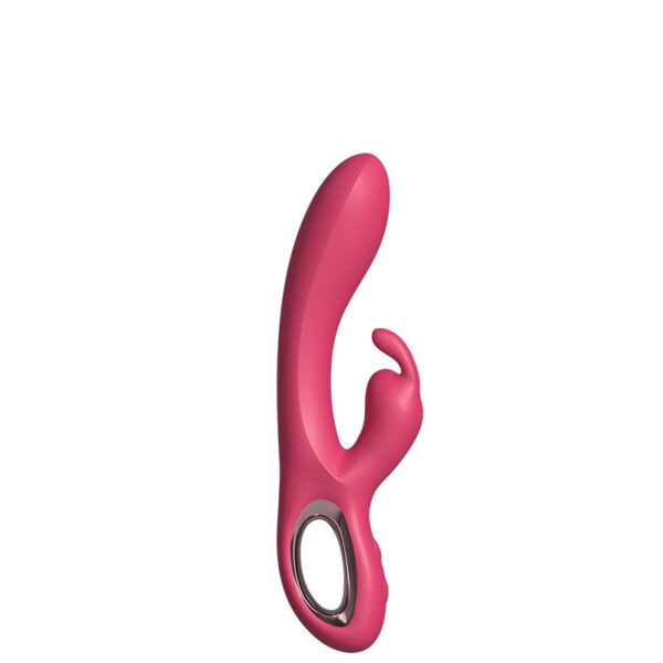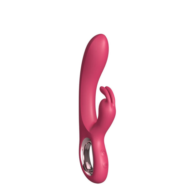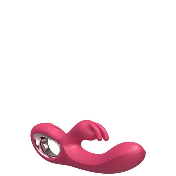 Vibrador recarregável ponto G com estimulador clitoriano com formato coelho e alça metalizada na extremidade. Possui 10 modos de vibração.