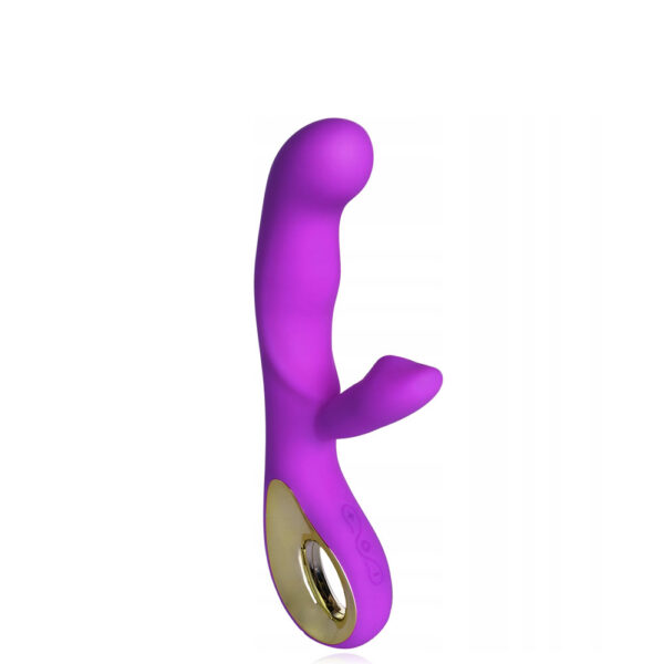 Vibrador recarregável ponto G com estimulador clitoriano e alça metalizada. Possui 10 modos de vibração.