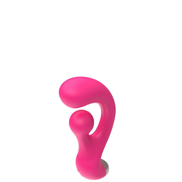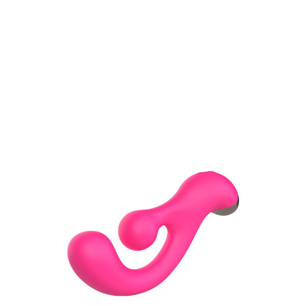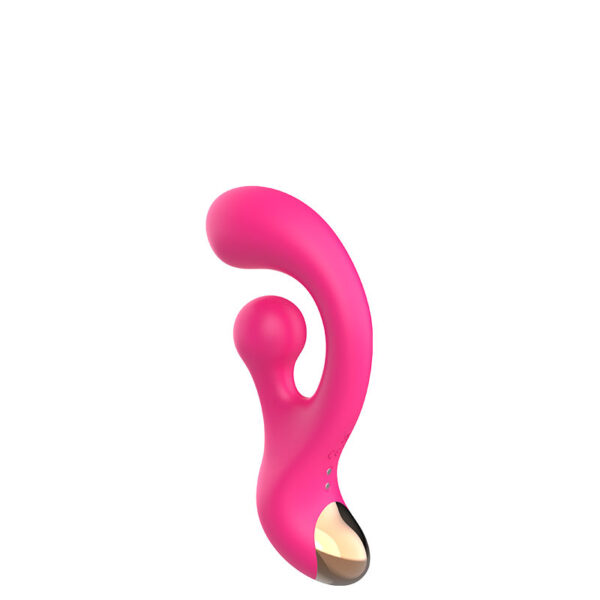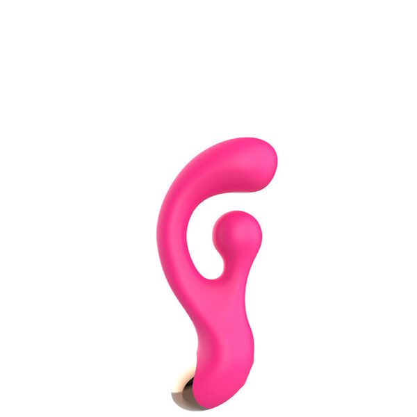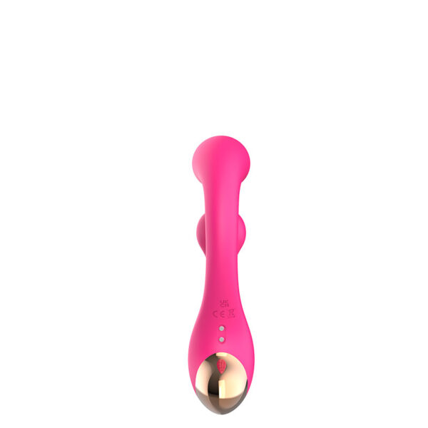 Vibrador recarregável ponto G com estimulador clitoriano rotativo. Possui 10 modos de vibração e 10 modos de rotação.