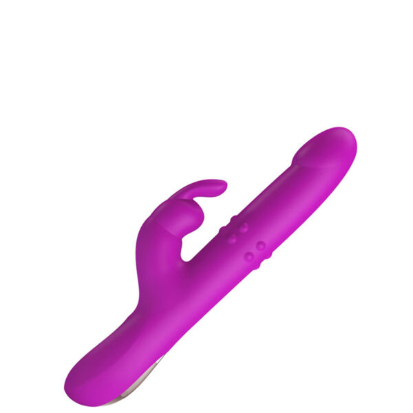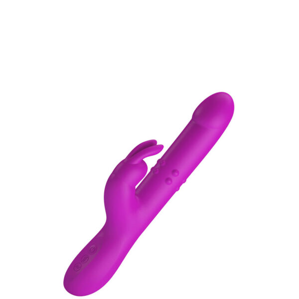 Vibrador recarregável rotativo sobe e desce com esferas rotativas e estimulador clitoriano vibratório formato coelho. Possui 12 modos de vibração e 4 modos de rotação.