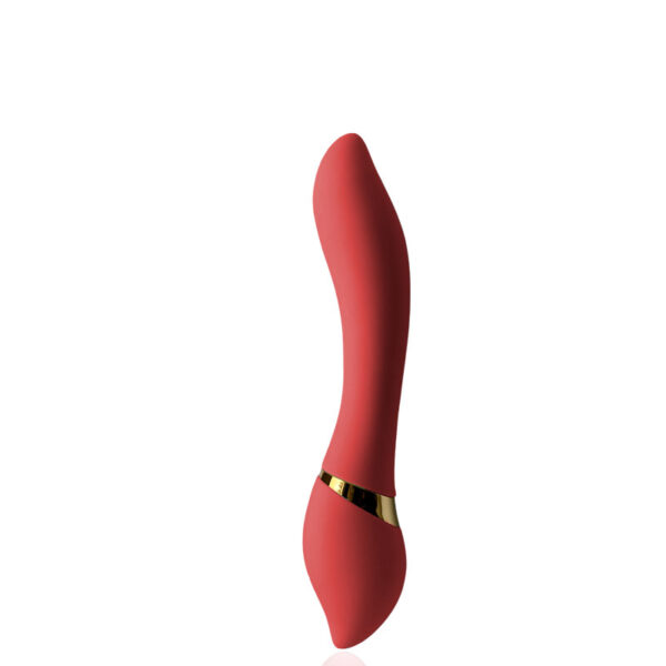 Vibrador recarregável sinuoso com detalhes em dourado. Possui 10 modos de vibração e função de aquecimento.