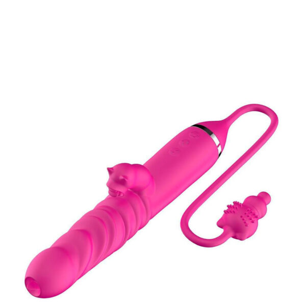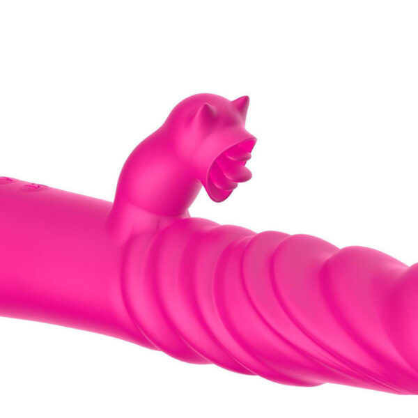 Vibrador recarregável vai e vem com estimulador clitoriano e penetrador com bullet formato gatinho. Possui 10 modos de vibração e 3 modos de vai e vem.