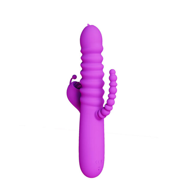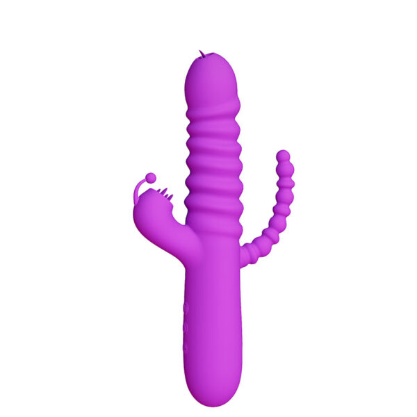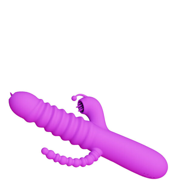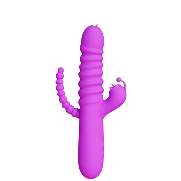 Vibrador recarregável vai e vem com estimulador clitoriano e penetrador anal escalonado. Possui 10 modos de vibração e 3 modos de vai e vem.