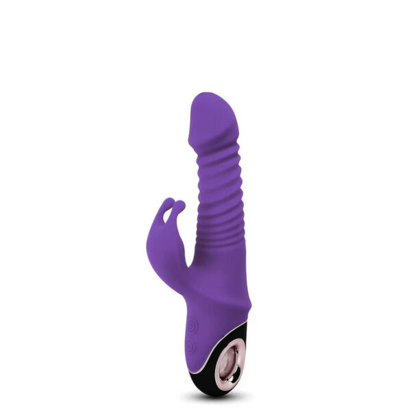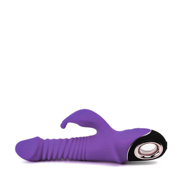 Vibrador recarregável vai e vem com estimulador clitoriano formato coelho. Possui 9 modos de vibração e 9 modos de movimentos.